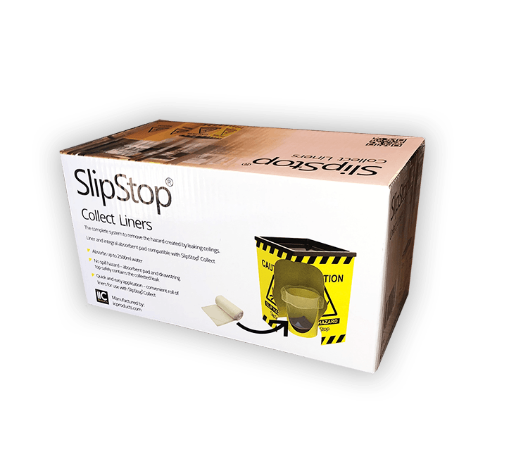 The leaking water is funnelled into the SlipStop® collection bucket, which contains the SlipStop® Absorb Liner, absorbing the water and removing the hazard.